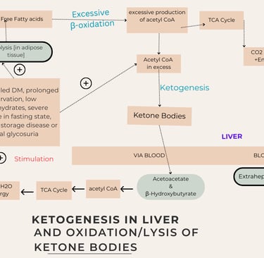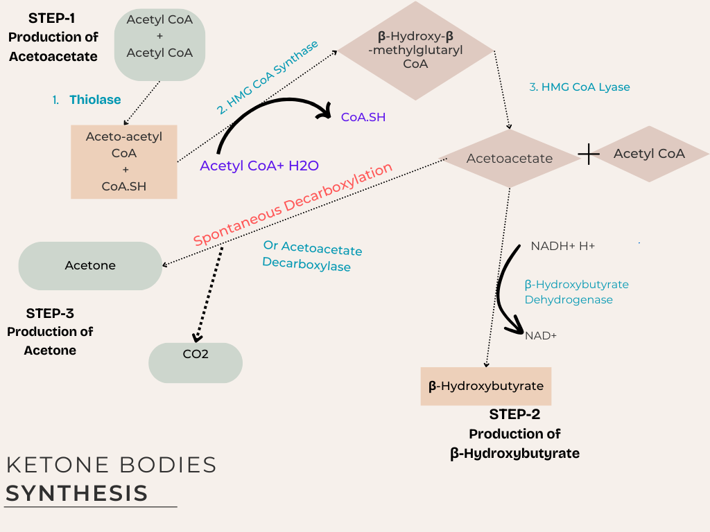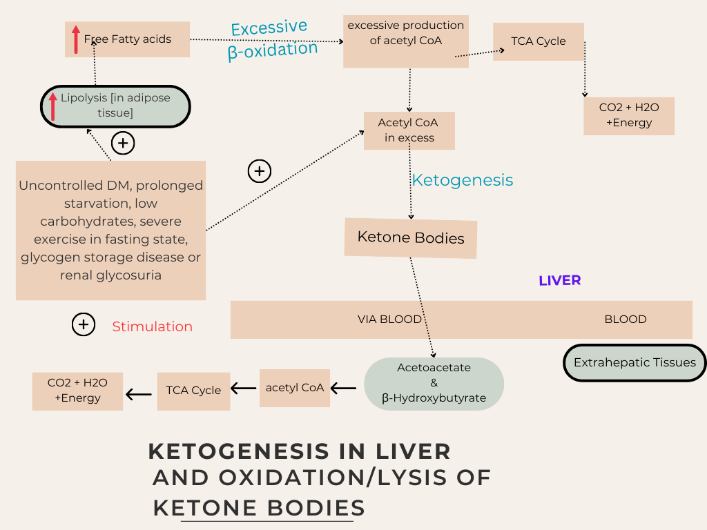 Under normal conditions, the Acetyl Coa formed in the liver enters the TCA cycle and is completely oxidized to carbon dioxide and water to provide energy. However, under certain metabolic/ physiologic and pathological conditions like diabetes mellitus, renal glycosuria, prolonged starvation, glycogen storage disease, infective hepatitis, etc, or when dietary carbohydrates are not sufficient the beta-oxidation of fatty acids is greatly accelerated in the liver. This results in more production of acetyl CoA. Excess of acetyl CoA cannot be fully utilized by the liver through the TCA cycle and is converted to ketone bodies namely acetoacetate beta-hydroxybutyrate and acetone.